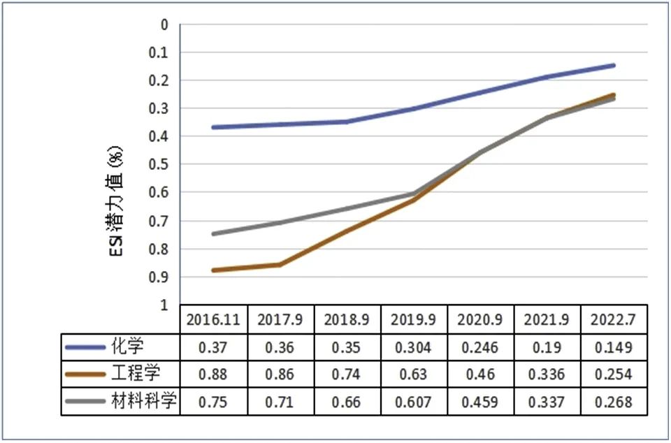 ¸ú×ÙÆÊÎöESIÓÅÊÆÑ§¿ÆÉú³¤Ç÷ÊÆ£¬Íƶ¯»¯Ñ§¡¢ÖÊÁÏ¿ÆÑ§¡¢¹¤³ÌѧESIÅÅÃûÒ»Á¬ÌáÉý¡£×Ô2016ÄêÒÔÀ´£¬»¯Ñ§Ñ§¿ÆÓÉ3.7¡ëÌáÉýµ½1.496¡ë£¬ÏÖÔÚ¹ú¼ÊÅÅÃû237£»ÖÊÁÏ¿ÆÑ§Ñ§¿ÆÓÉ7.5¡ëÌáÉýµ½2.682¡ë£¬ÏÖÔÚ¹ú¼ÊÅÅÃû306£»¹¤³Ìѧѧ¿ÆÓÉ8.8¡ëÌáÉýµ½2.543¡ë£¬ÏÖÔÚ¹ú¼ÊÅÅÃû503£»ÆäÖл¯Ñ§Ñ§¿Æ³åǧ³ÌÐòÒ»Ö±¼ÓËÙ£¬Ñ§¿Æ¹ú¼ÊÓ°ÏìÁ¦Ò»Ö±ÌáÉý¡£
