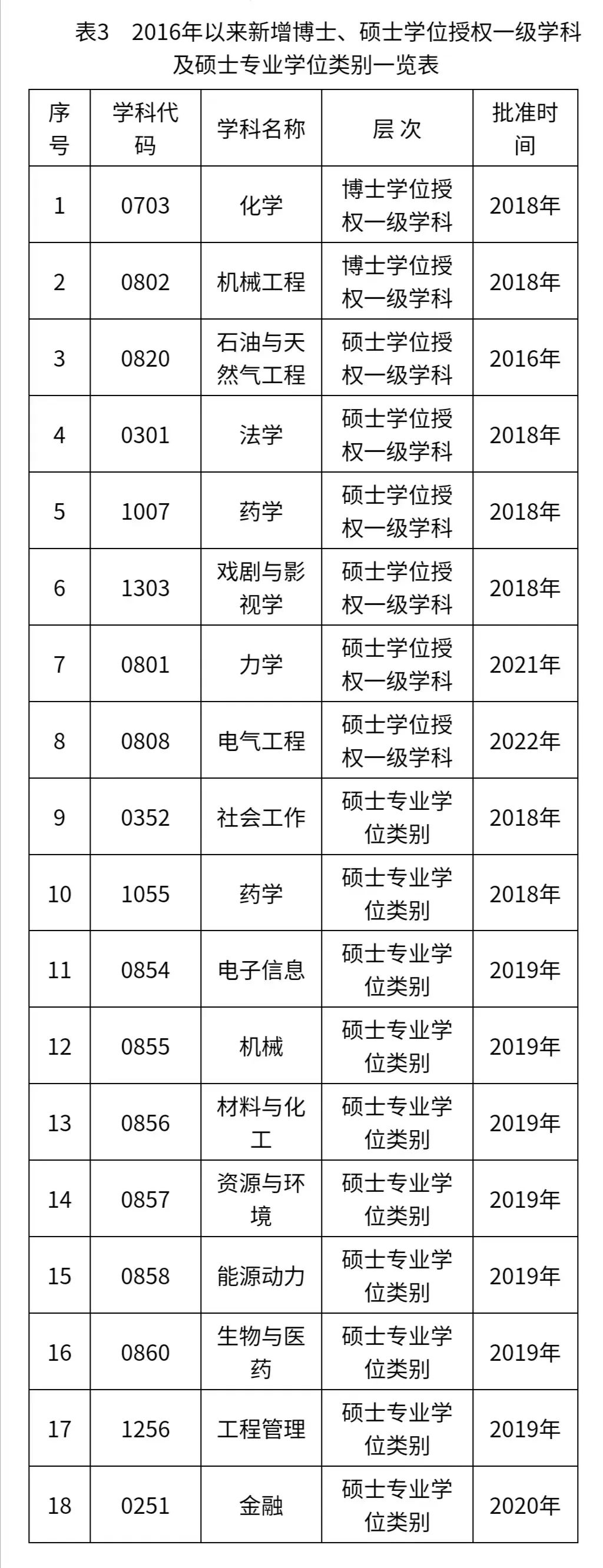 ×Ô2016ÄêÒÔÀ´£¬Ñ§Ð£»ñÅú»¯Ñ§¡¢»úе¹¤³Ì2¸ö²©Ê¿Ñ§Î»ÊÚȨһ¼¶Ñ§¿Æ£¬·¨Ñ§¡¢Ò©Ñ§¡¢Ï·¾çÓëÓ°ÊÓѧ¡¢Á¦Ñ§¡¢µçÆø¹¤³Ì5¸ö˶ʿѧλÊÚȨһ¼¶Ñ§¿Æ£¬Éç»áÊÂÇ顢ҩѧ2¸ö˶ʿרҵѧλÖÖ±ð¡£ÔÚ¹¤³Ì˶ʿרҵѧλÊÚȨµã¶ÔÓ¦µ÷½âÊÂÇéÖУ¬½«12¸ö¹¤³ÌÁìÓòµ÷½â³Éµç×ÓÐÅÏ¢¡¢»úе¡¢ÖÊÁÏÓ뻯¹¤¡¢×ÊÔ´ÓëÇéÐΡ¢ÄÜÔ´¶¯Á¦¡¢ÉúÎïÓëÒ½Ò©¡¢¹¤³ÌÖÎÀí7¸öרҵѧλÖÖ±ð¡£Ñ§Ð£¼á³Ö¡°ÓÐËù²»Îª¡±ÔÔò£¬×Ô¾Ù´ë·ÏÉú³¤Ô¶¾°Ç·ºÃµÄϸÃÜÒÇÆ÷¼°»úе¡¢Ç鱨ѧ2¸ö˶ʿѧλÊÚȨµã£¬¶ÔÓ¦µ÷½âÔöÁÐʯÓÍÓë×ÔÈ»Æø¹¤³Ì¡¢½ðÈÚ2¸ö˶ʿѧλÊÚȨµã£¨±í3£©¡£×èÖ¹ÏÖÔÚ£¬Ñ§Ð£¹²ÓÐ5¸ö²©Ê¿Ñ§Î»ÊÚȨһ¼¶Ñ§¿Æ£¬24¸ö˶ʿѧλÊÚȨһ¼¶Ñ§¿Æ£¬16¸ö˶ʿרҵѧλÖÖ±ð£¬ÊµÏÖÁ˸÷½ÌѧѧԺ˶ʿһ¼¶Ñ§¿ÆÊÚȨµãÈ«ÁýÕÖ¡£